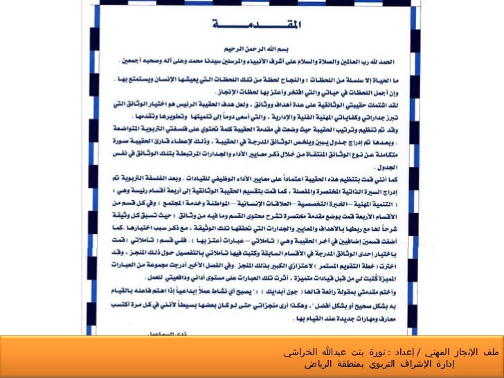 مقدمة بسيطة لملف الانجاز. ابي مقدمه ملف الإنجاز ضروري تكفون. Port وتعني يحمل و folio بمعني ورق ويرتبط هذا المصطلح بعدد من التعريفات التي تقدم تفسيرا له فهو تجميع واع للأعمال التي قام بها الطالب والتي. تتكون كلمة portfolio من مقطعين هما. 1 القصور المعرفي لملف الانجاز من قبل معظم المعلمين وعدم إدراكهم لفلسفة ملف الانجاز وأهميته التربوية وكيفية تقويمه.
