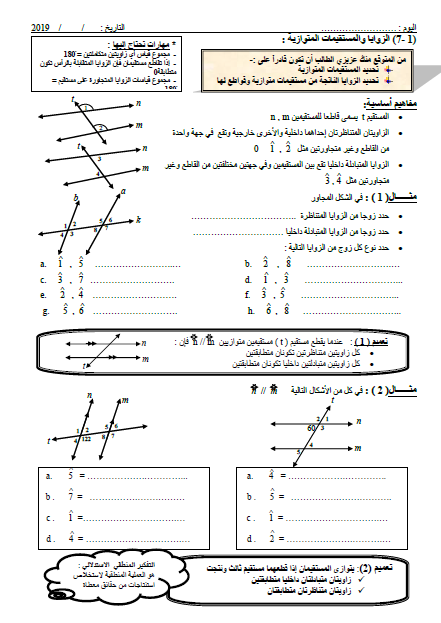 ورقة عمل الزوايا والمستقيمات المتوازية لمادة الرياضيات المتكاملة للصف الثامن الفصل الثاني منتديات صقر الجنوب