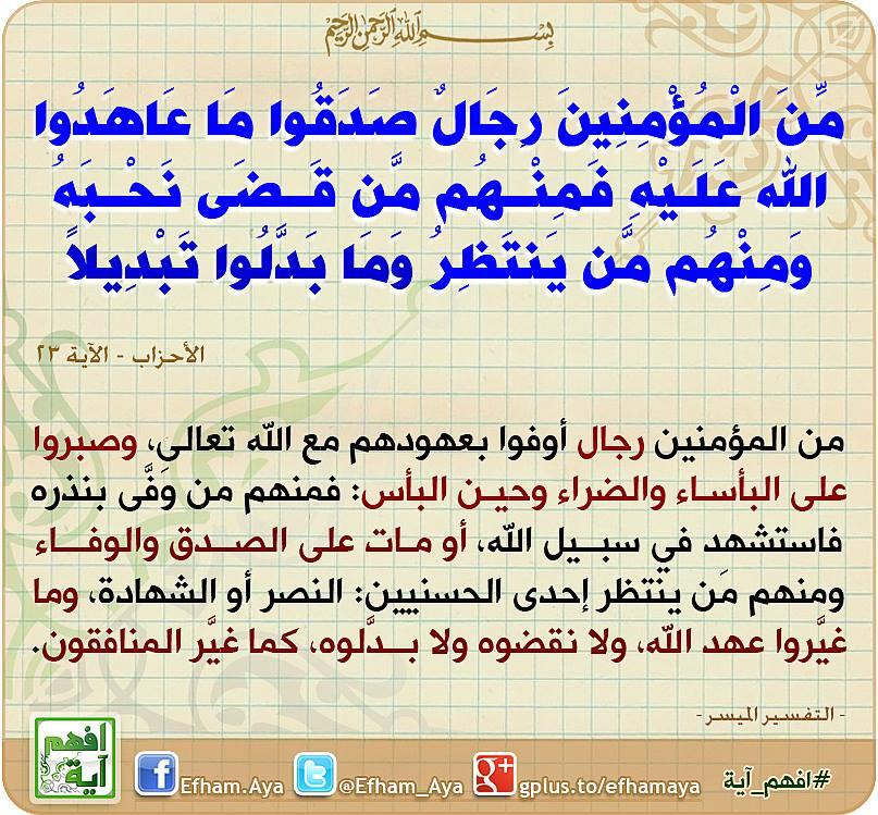 افهم آية Ar Twitter من المؤمن ين رجال صدقوا ما عاهدوا الله عليه فمنهم من قضى نحبه ومنهم من ينتظر وما بدلوا تبديلا افهم آية قرآن Http T Co Mtvgkfv0lo