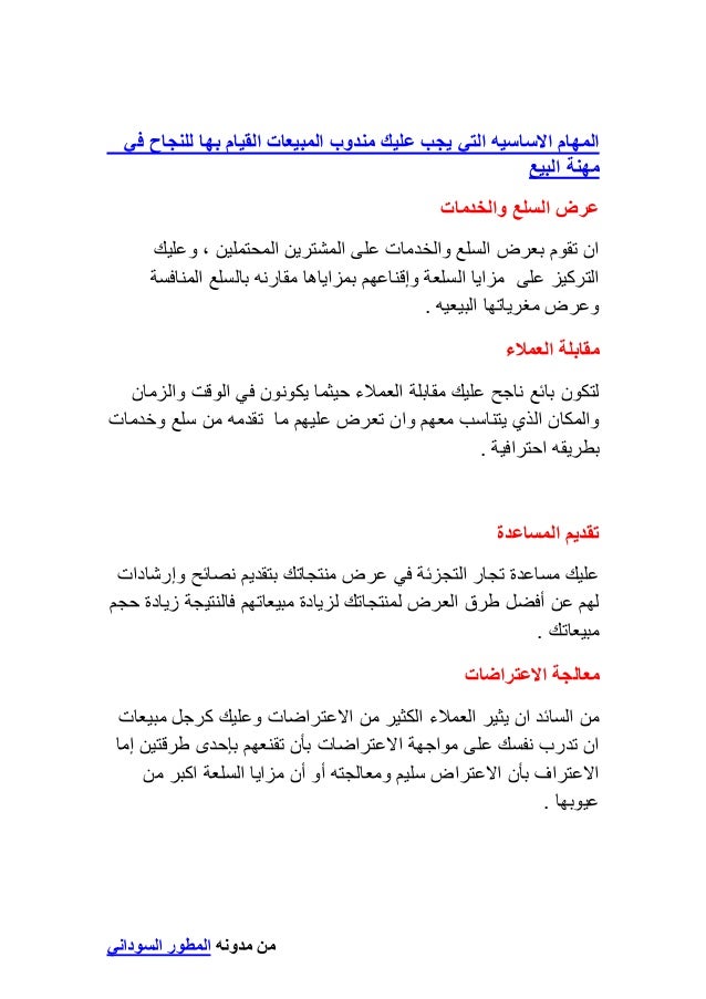 مهام مندوب المبيعات pdf. الوصول إلى كاف ة الزبائن في الأوقات الم خص صة لذلك وبشكل منتظم. متابعة الحضور والانصراف لموظفي المبيعات وتقييم أدائهم والتأكد من أنهم يحققون أهداف البيع التارجت. عرض السلع والخدمات عليهم بصورة مناسبة وتشجيعهم على زيادة الإقبال عليها. الناجح المبيعات مندوب صفات عاليه مبيعات نسب تحقق في تفشل هل بنعم إجابتك كانت إذا.