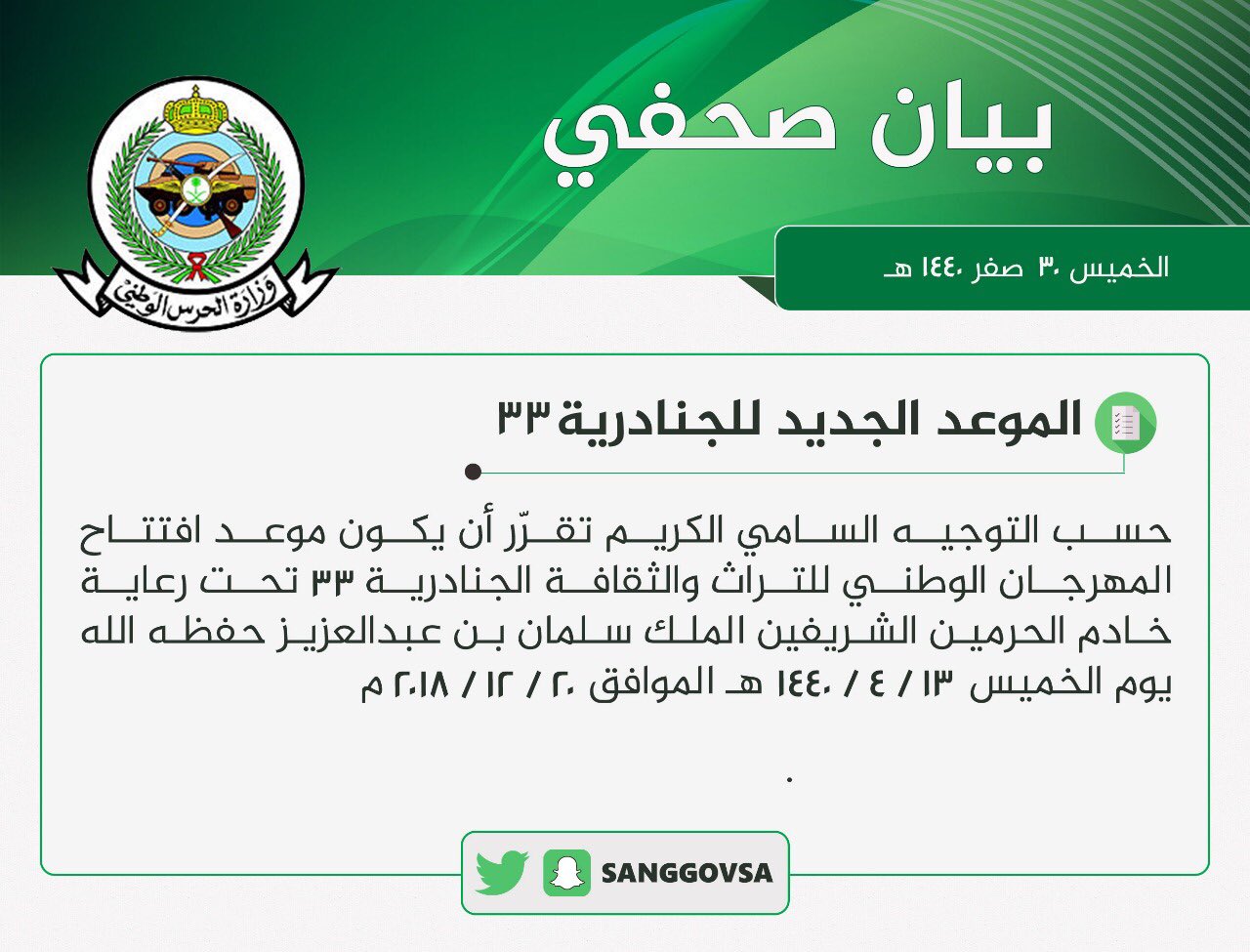 مواعيد مهرجان الجنادرية 33 لعام 2018 1440. الرياض 04 صفر 1441 هـ الموافق 03 أكتوبر 2019 م واس حددت وزارة الثقافة شهر نوفمبر من عام 2020م موعدا للانطلاقة الجديدة للمهرجان الوطني للتراث والثقافة الجنادرية بعد تسل مها مهمة الإشراف على المهرجان من وزارة الحرس الوطني في. مواعيد زيارة مهرجان الجنادرية 33 المهرجان الوطنى للتراث والثقافة 2018 1440. مدة المهرجان 3 اسابيع مواعيد زيارة الرجال للجنادرية من يوم الجمعة 21 ديسمبر 2018 حتى يوم الإثنين 24 ديسمبر 2018.